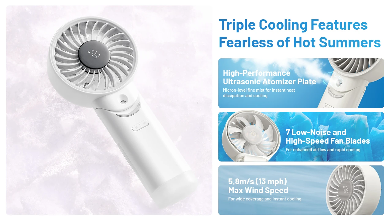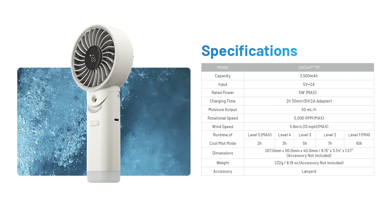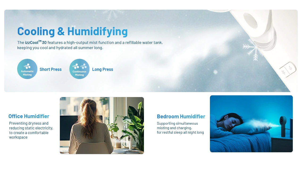 Le nouveau izzCool™ 30 est le mini climatiseur portable pliable idéal pour affronter la chaleur partout. Grâce à sa fonction brumisateur ultrasonique et son design 3-en-1 (main, bureau, cou), il offre une fraîcheur instantanée et un confort optimal.